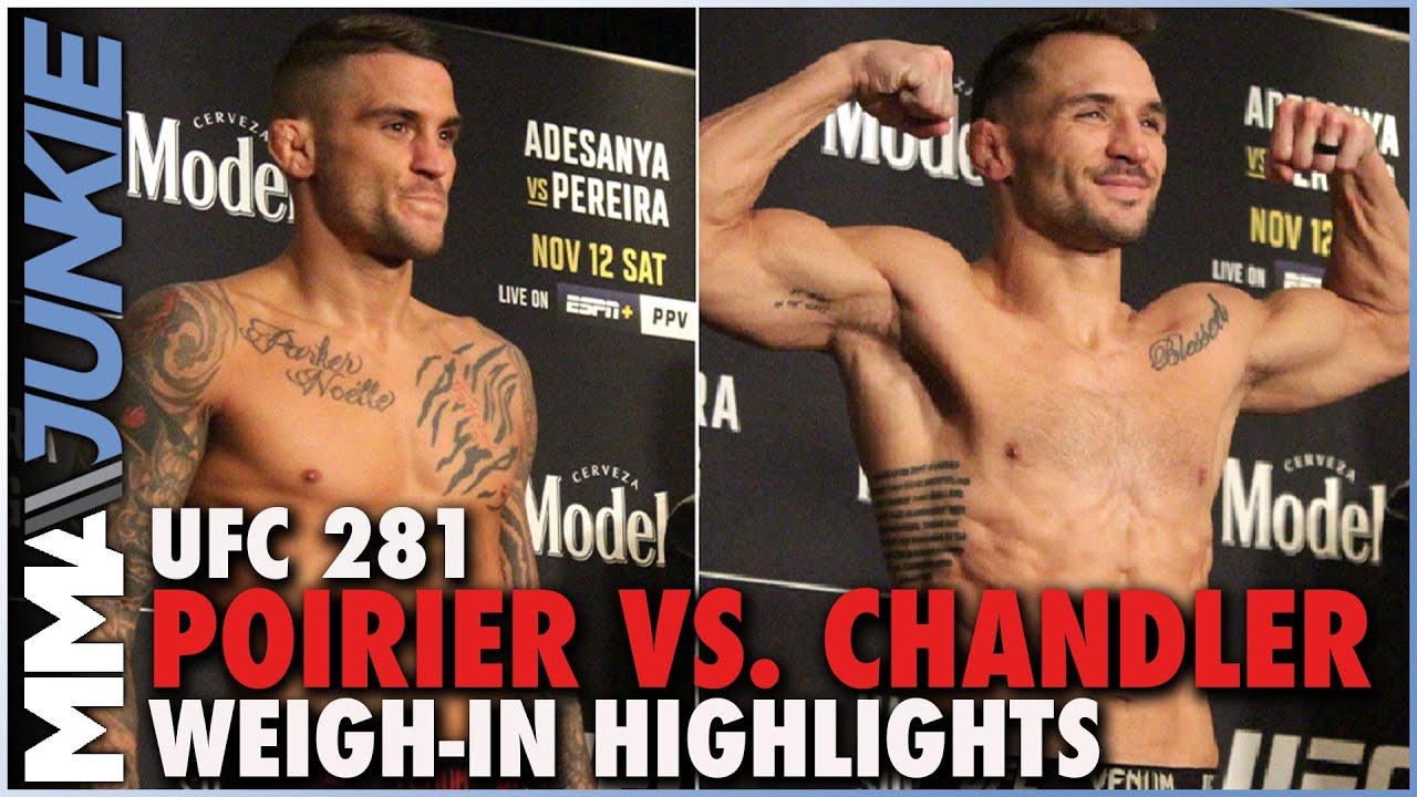 Watch former interim UFC champ Dustin Poirier and former Bellator champ Michael Chandler make weight for their UFC 281 featured bout on Saturday in New York.
